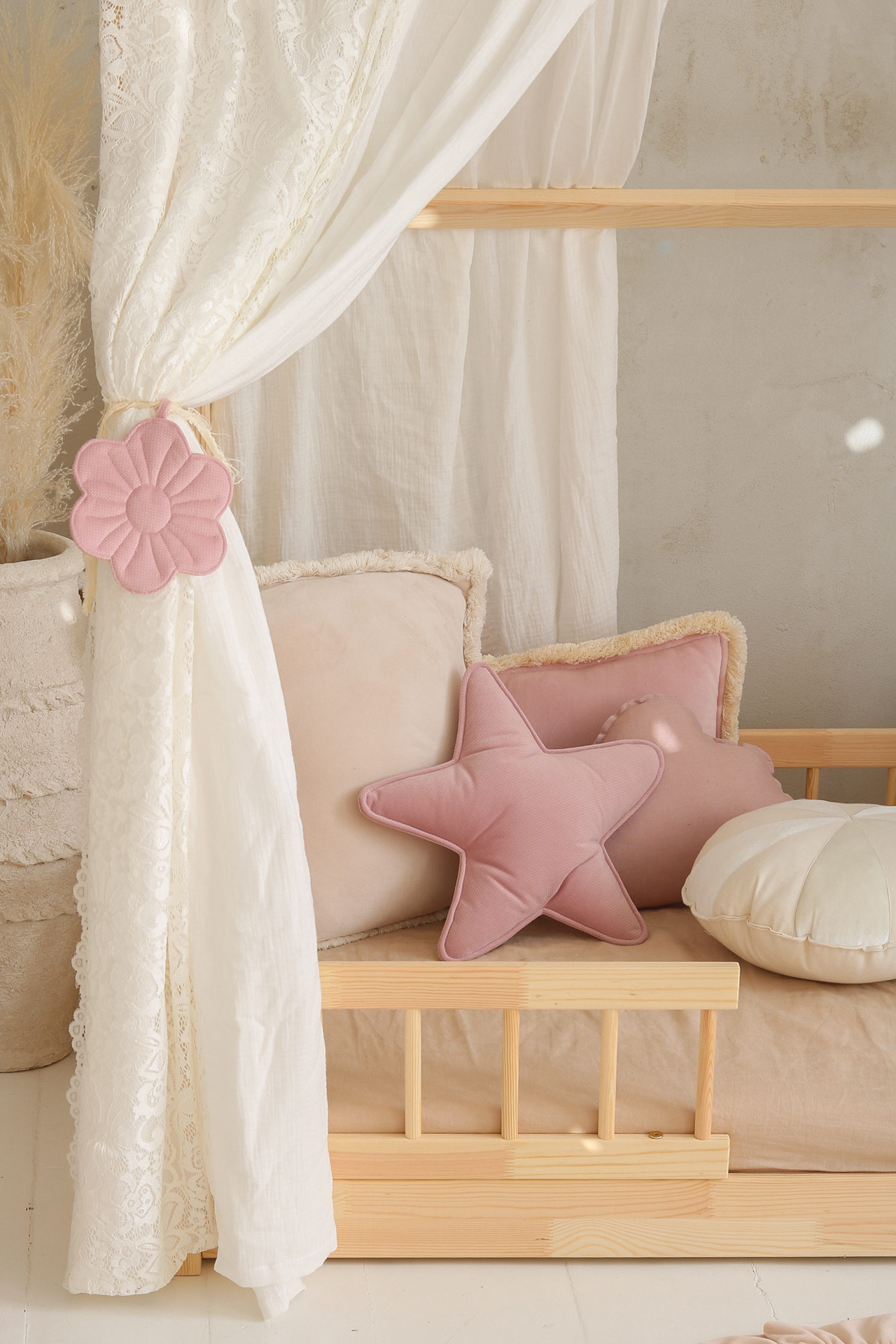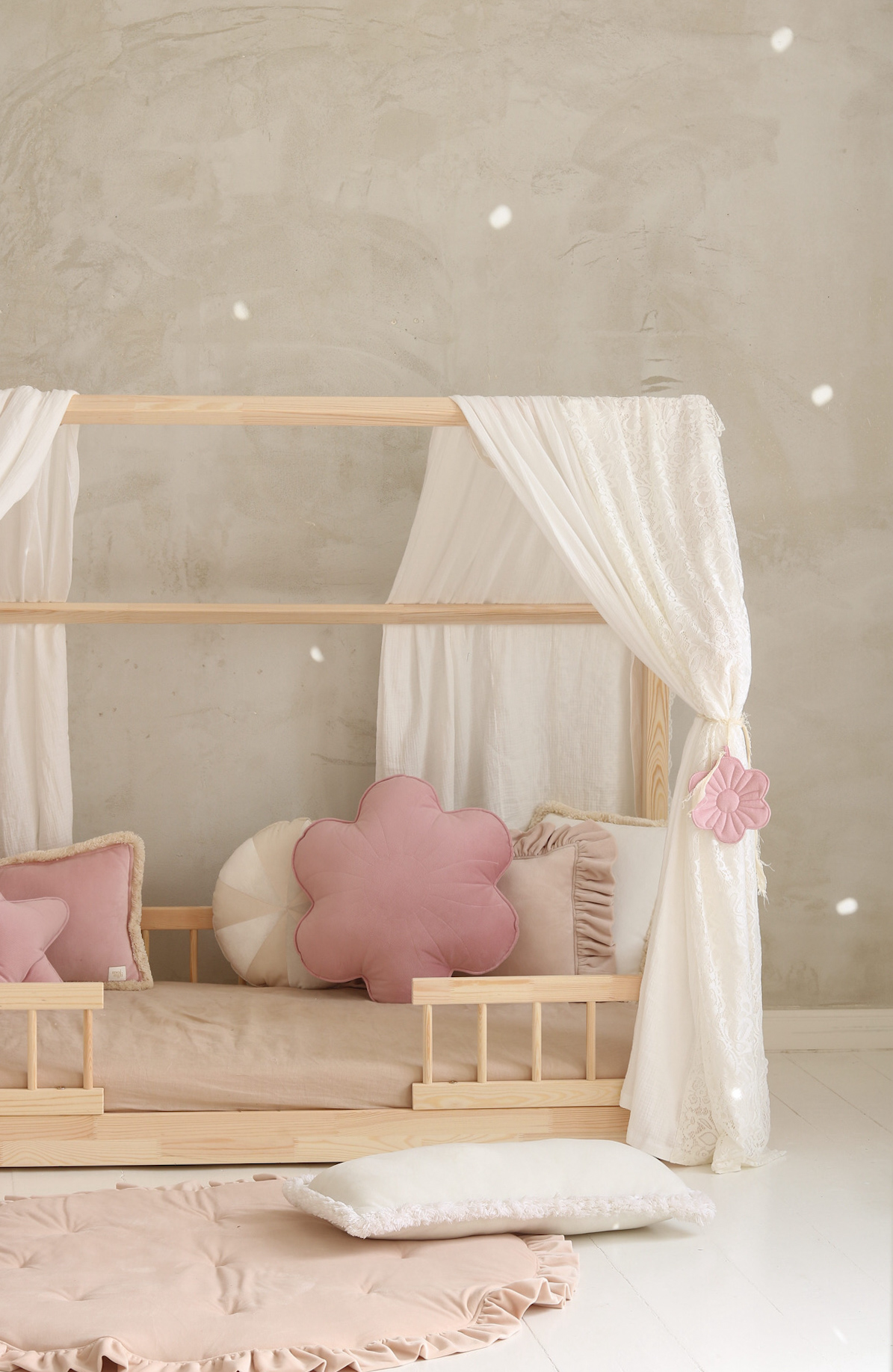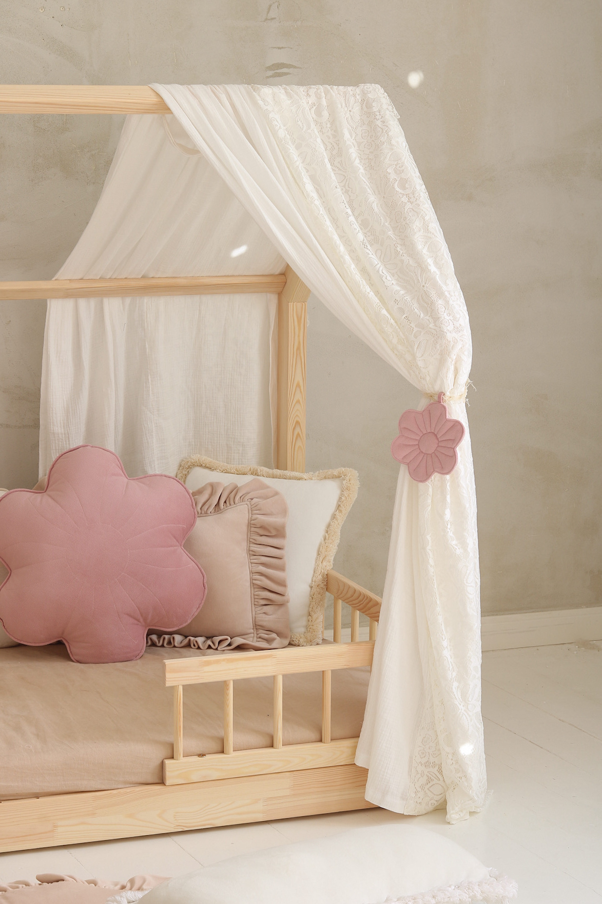 Designed with the needs of the little ones in mind, our canopy is not only aesthetically pleasing, but also functional. Its soft fabric creates a pleasant atmosphere, conducive to peaceful sleep and relaxation .Attaching the canopy to the bed frame is done with practical ties, which guarantees easy installation and a secure hold, ideal for active toddlers.