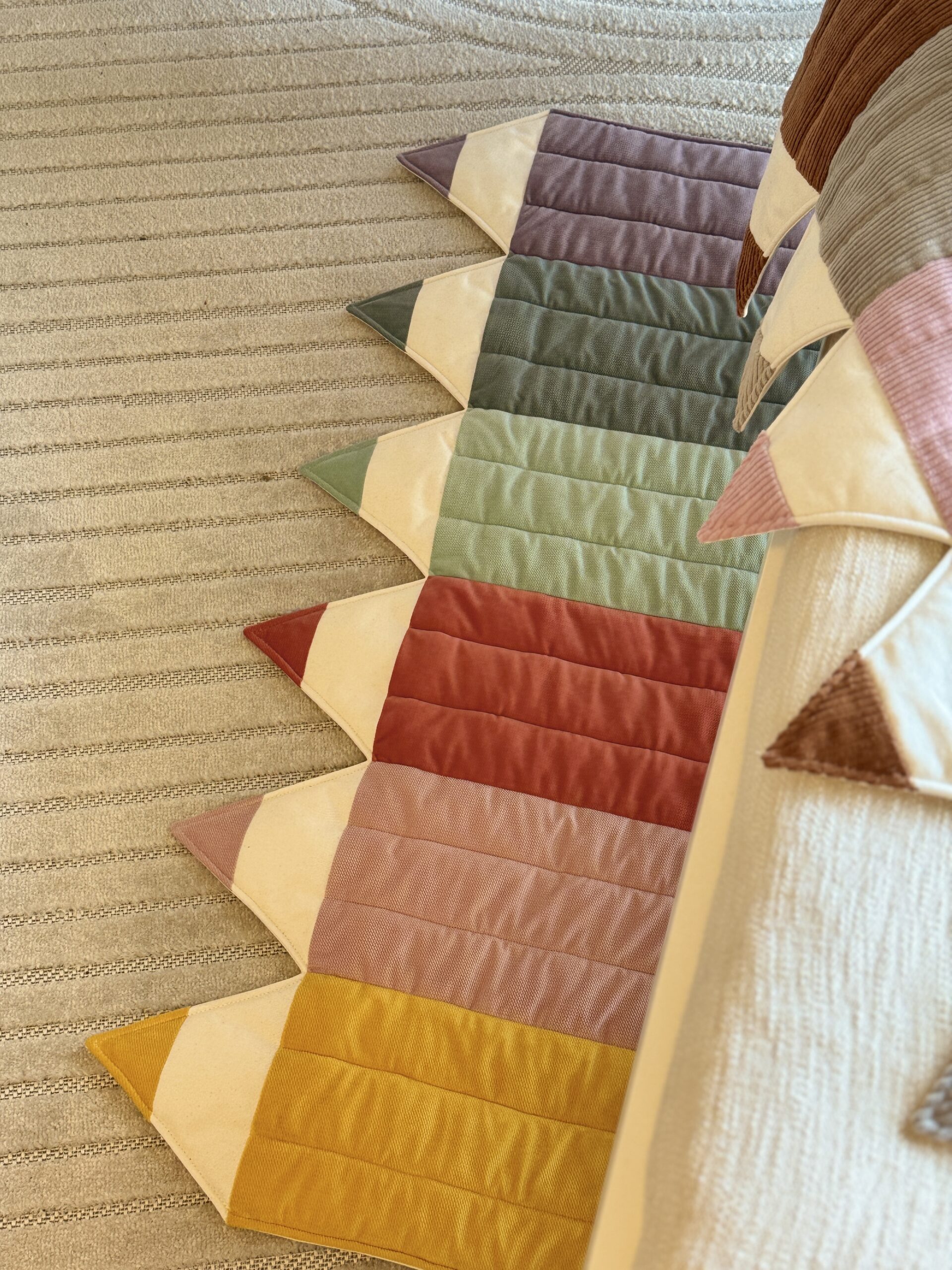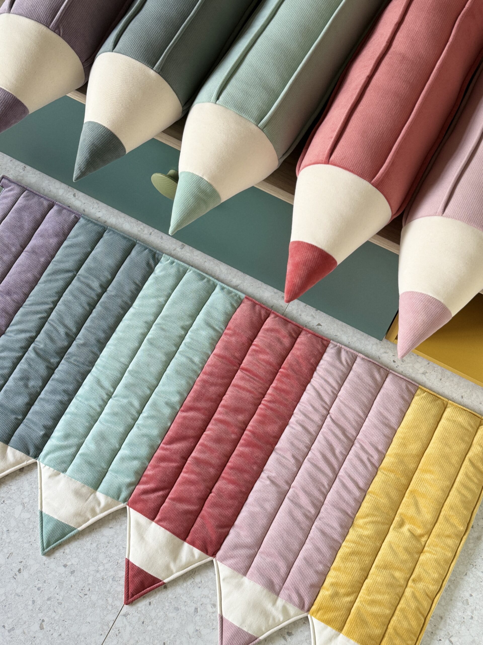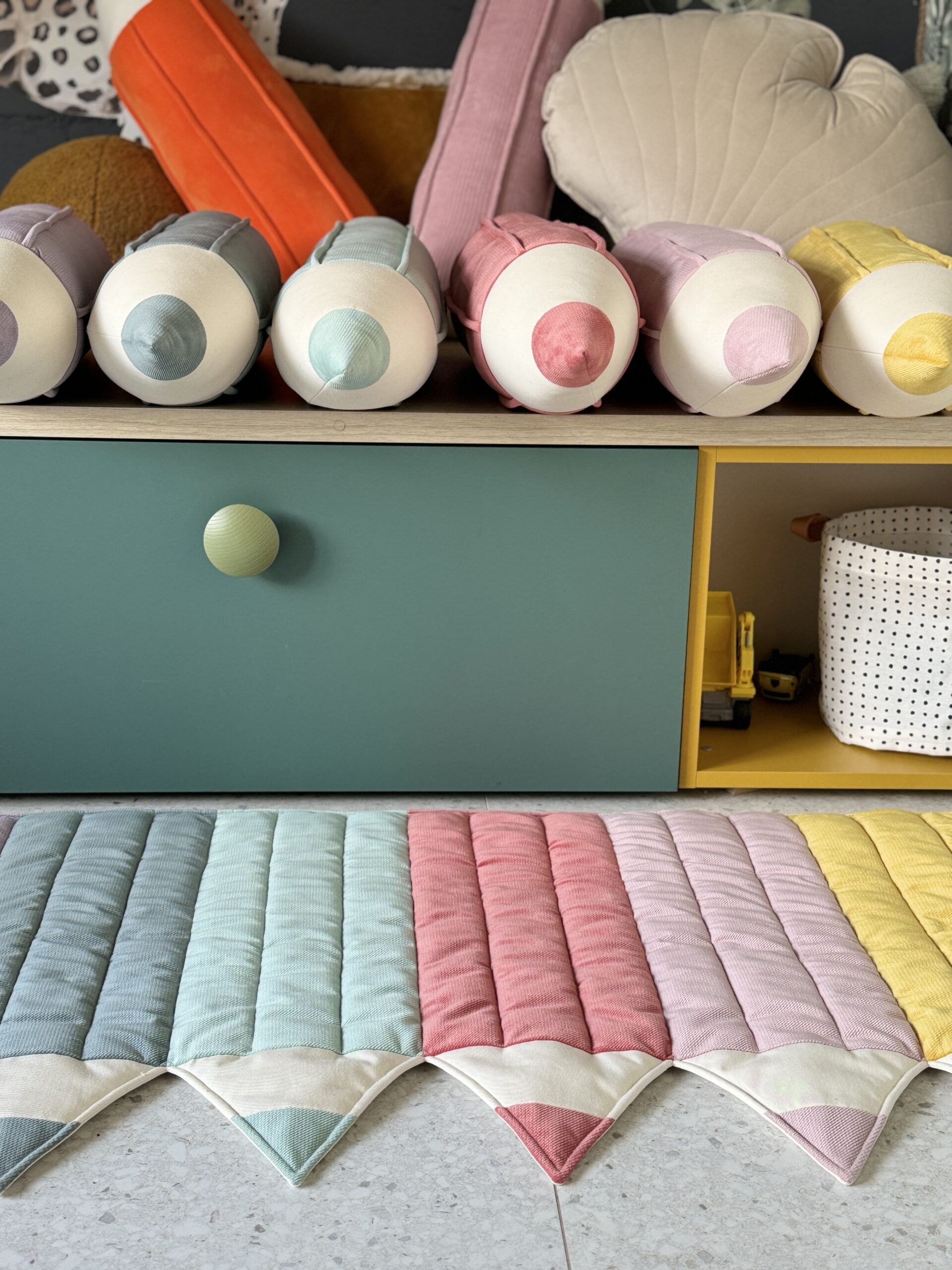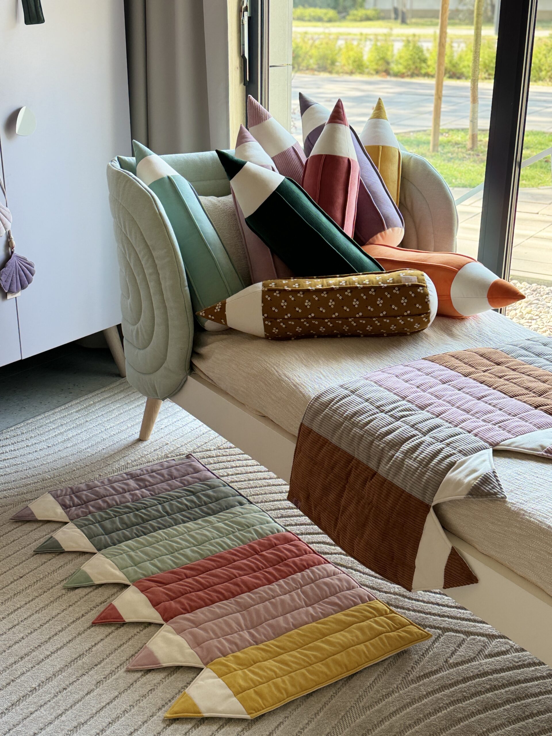 The crayon-shaped mat, sewn firmly from cotton and velvet in versatile sand colour. It works perfectly as a small rug by the child’s bed, a play mat for the baby on the floor or in the garden.