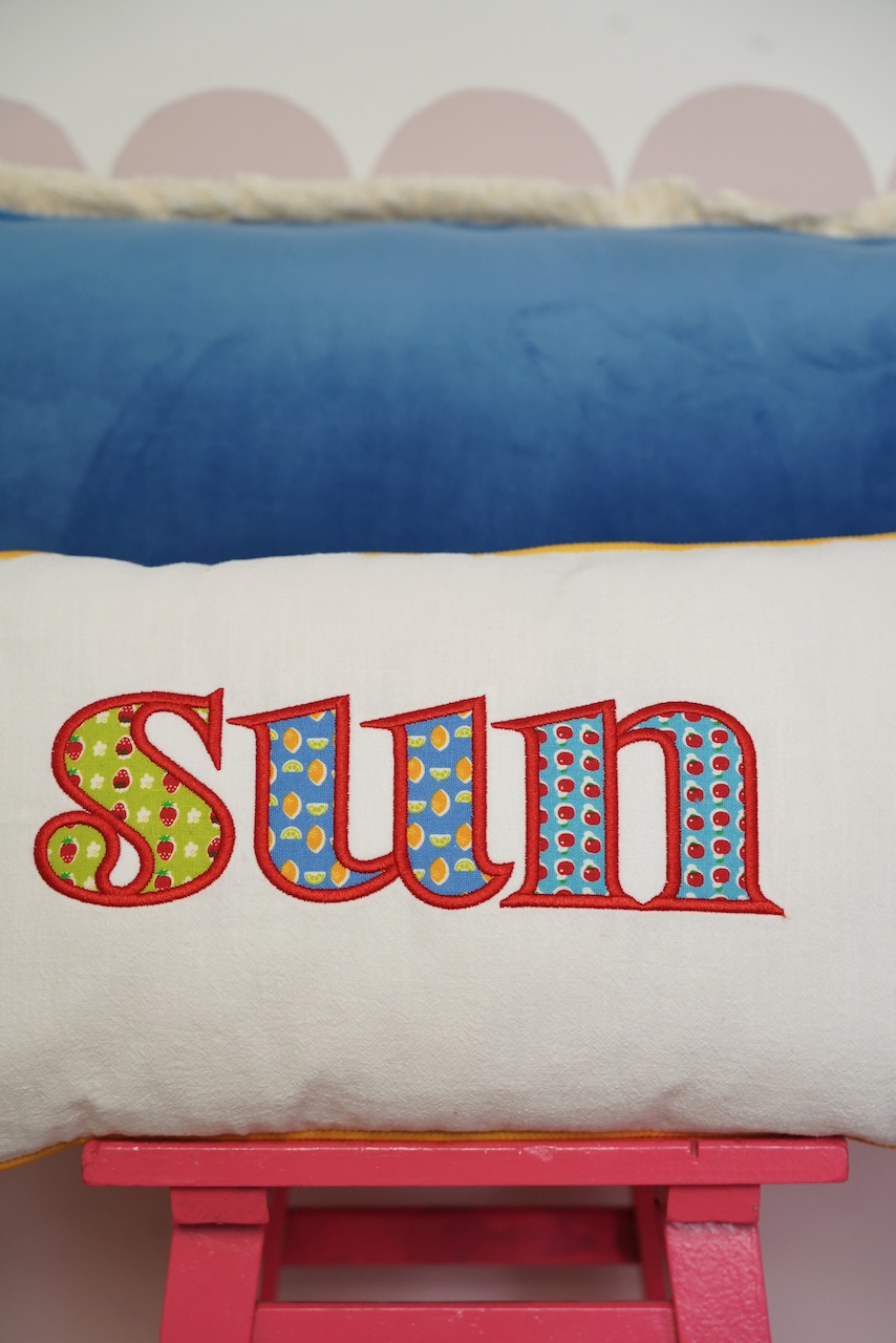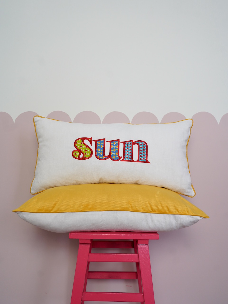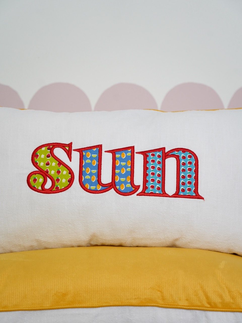 Decorative pillowcase with colorful embroidered “Sun” lettering