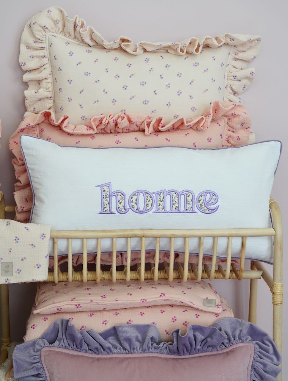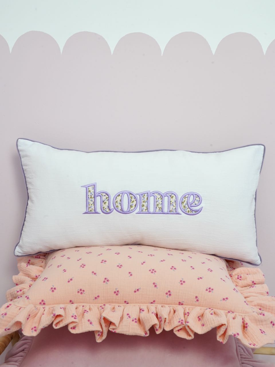 Decorative pillowcase with a floral embroidered “Home” lettering
