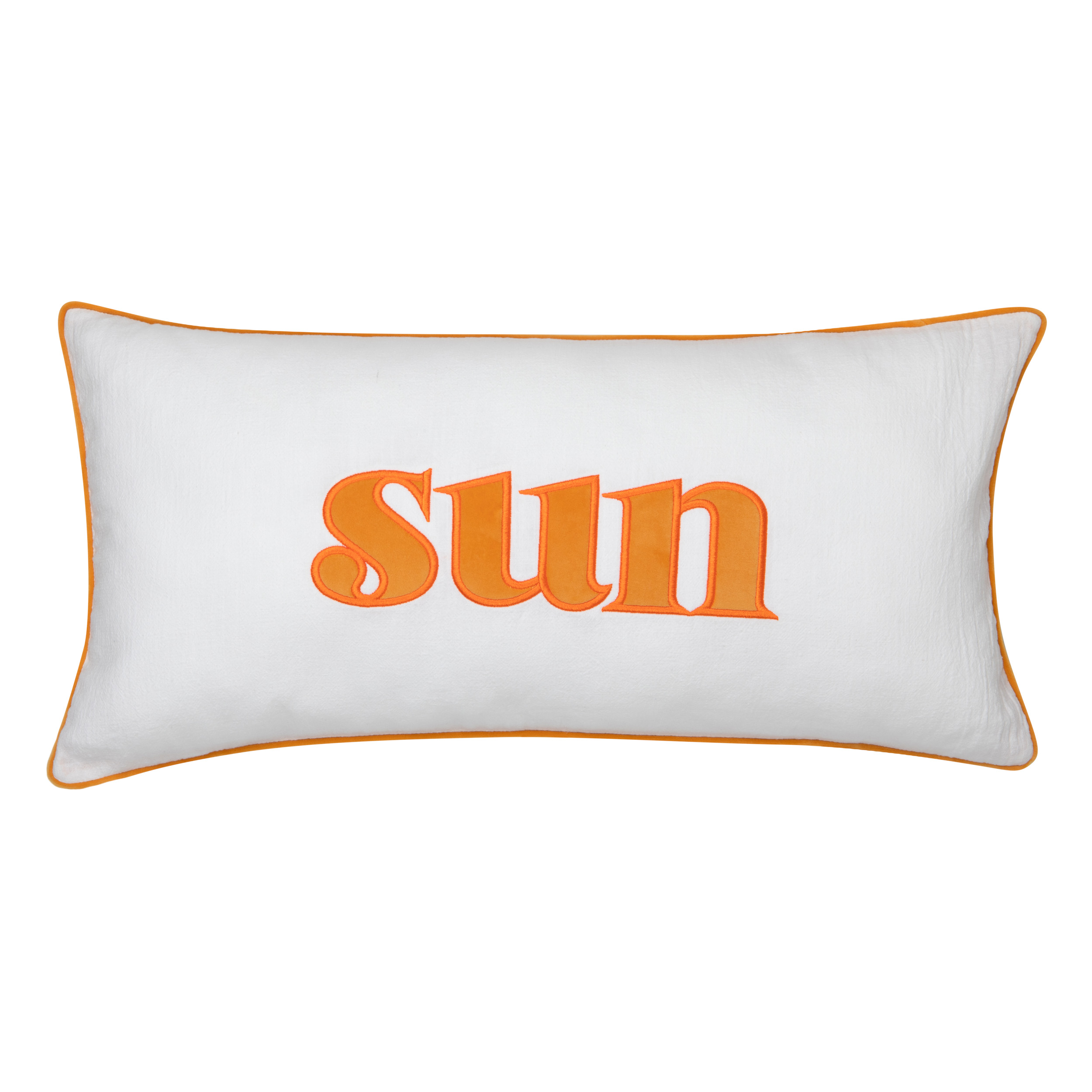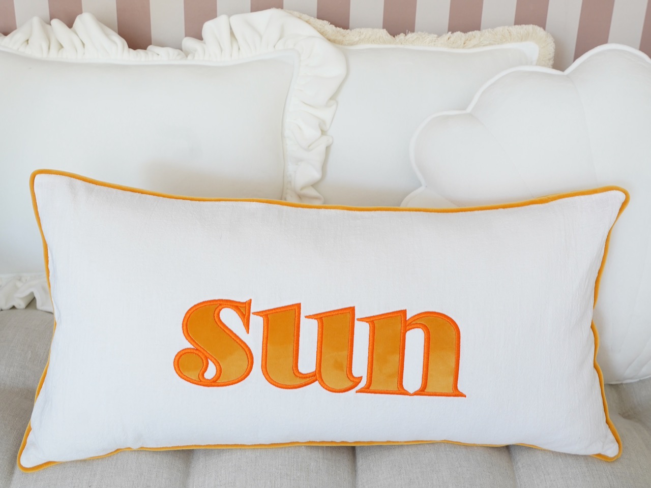 Decorative pillowcase with mustard embroidered “Sun” lettering
