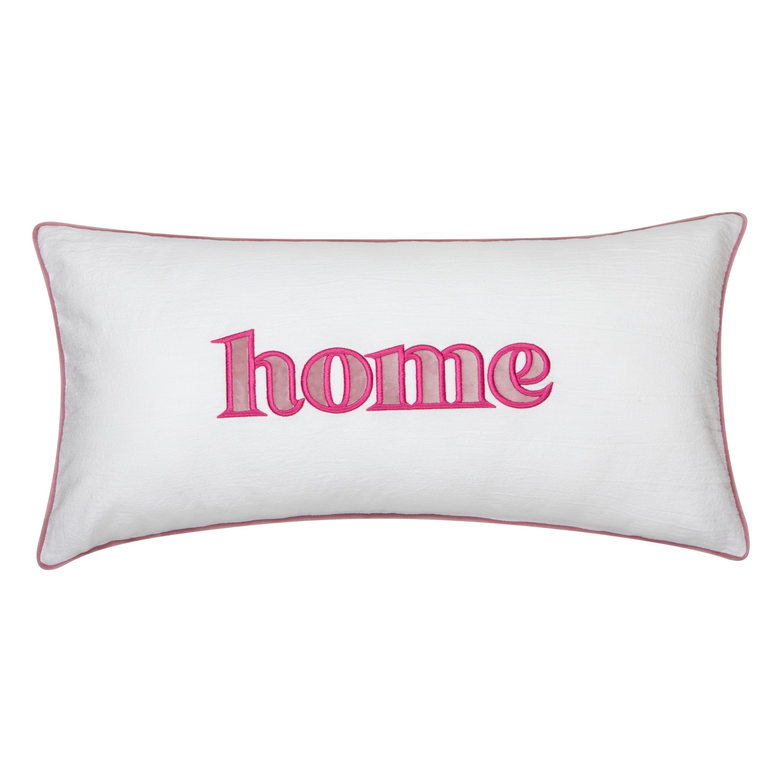 Decorative pillowcase with a pink embroidered “Home” lettering