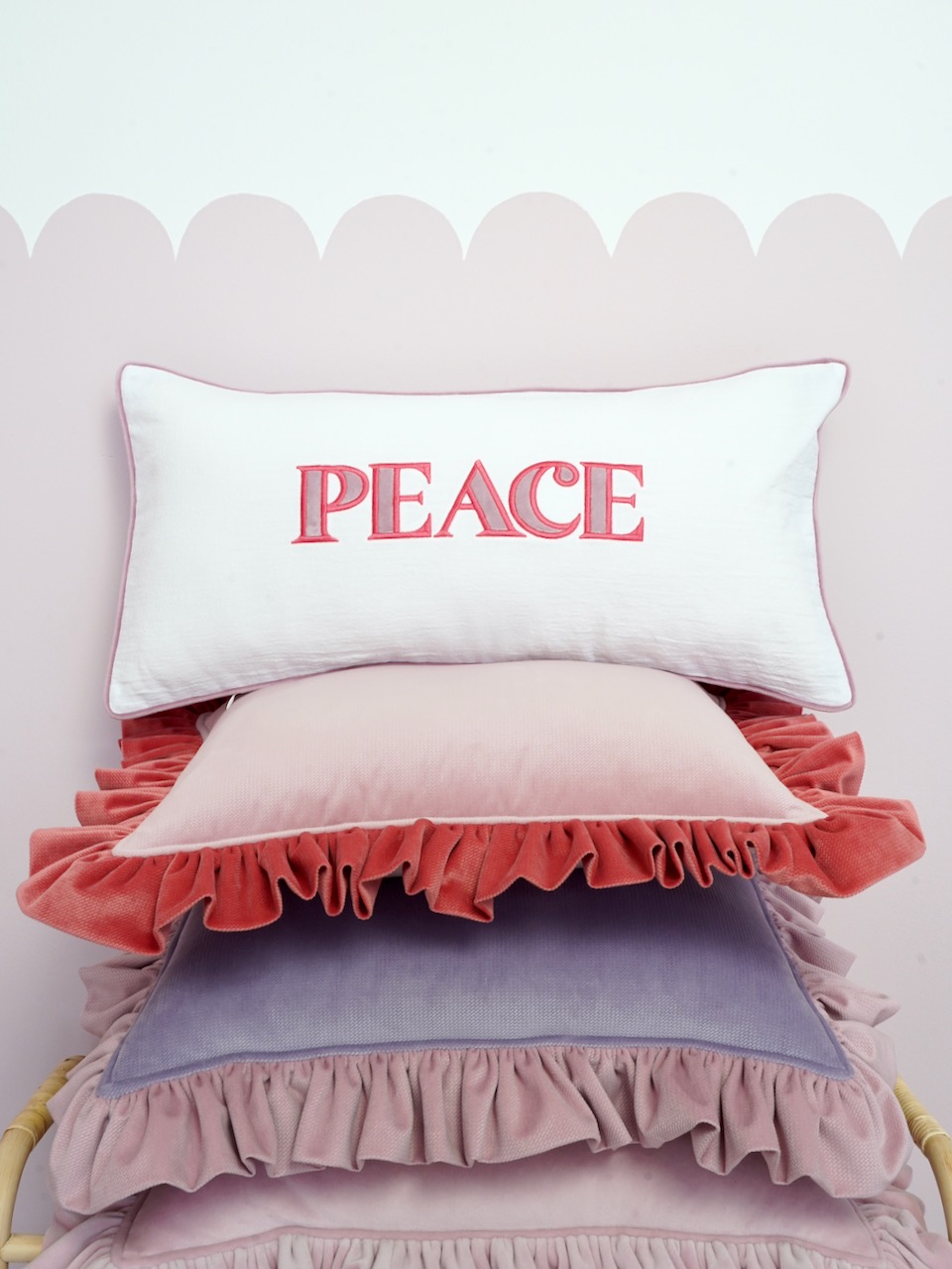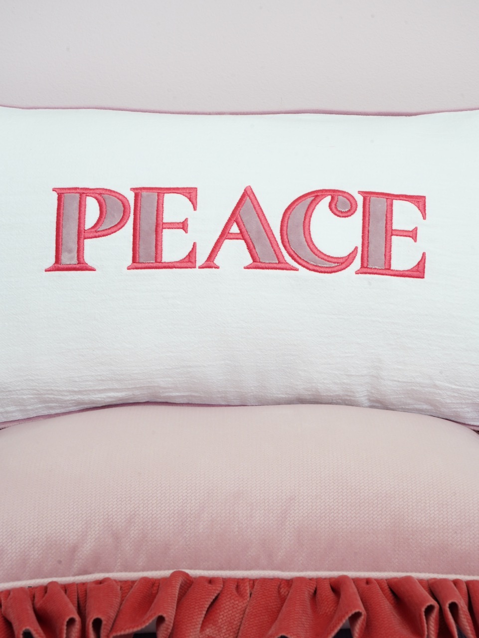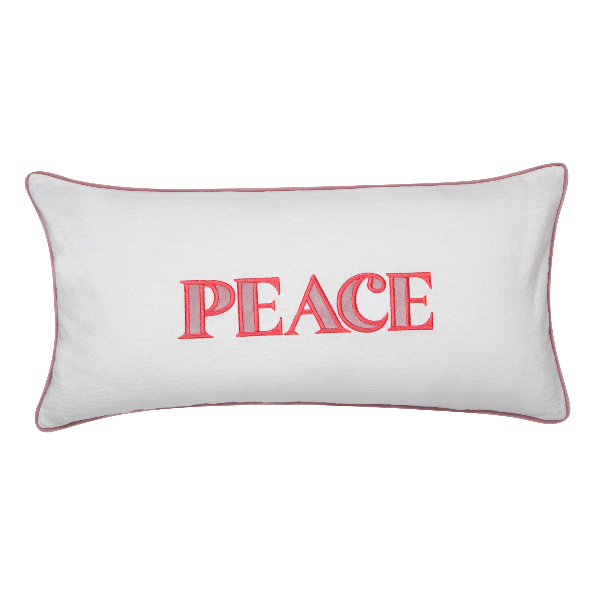 Decorative pillowcase with a pink embroidered “Peace” lettering