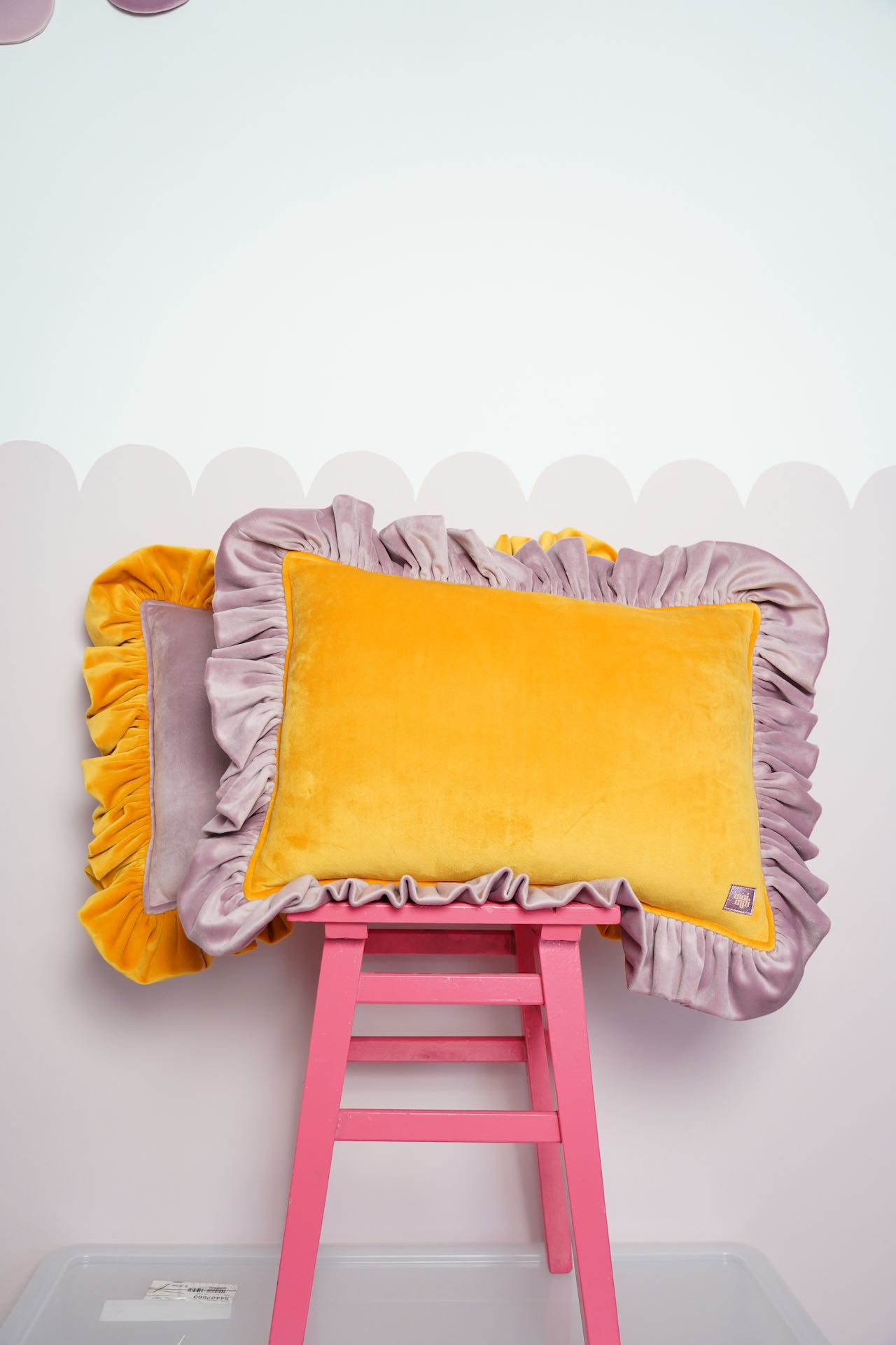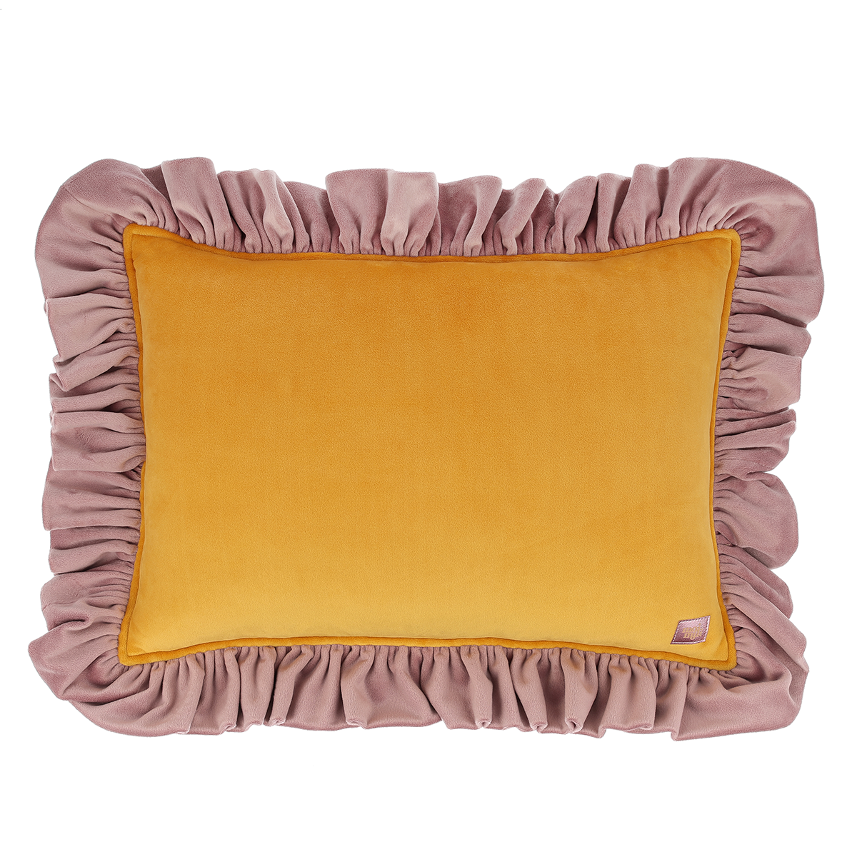 A beautiful fluffy cushion with a romantic frill, carefully sewn from high quality caramel-coloured velvet fabric with elastane that lays beautifully and shines. Super soft to touch, for the bedroom and the living room.