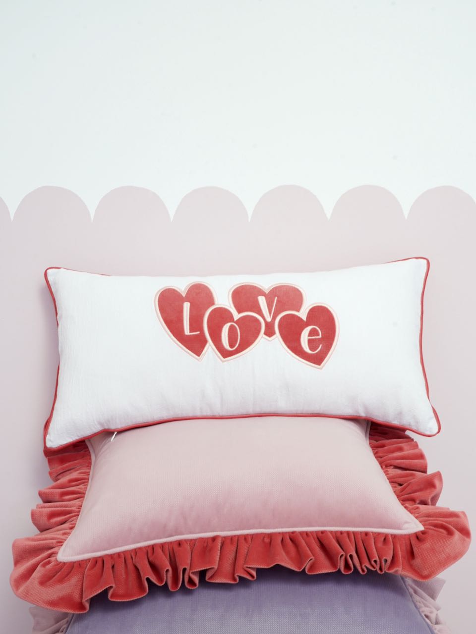 The most important features of the decorative velvet pillow with frills “Raspberry smoothie”: