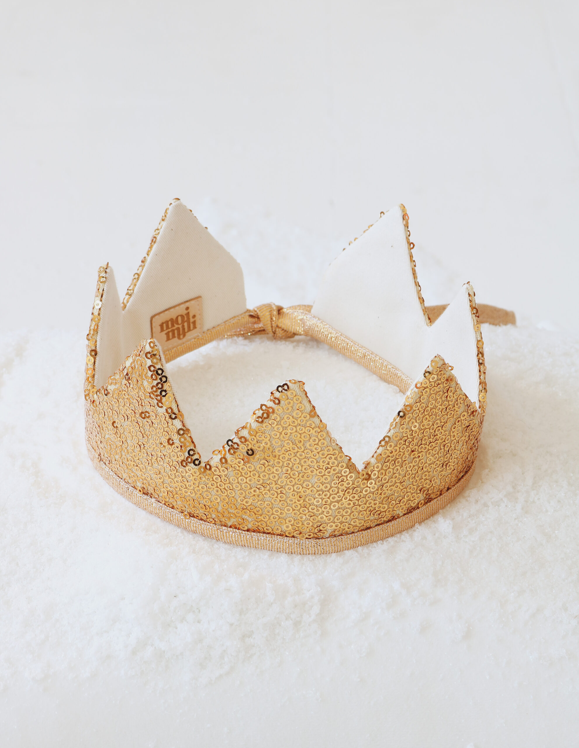 The set consists of two elements: a crown and a wand, both gold-coloured. The double-sided crown is carefully made of high quality cotton fabric and sequins. As it is tied in the back, it easily fits both a toddler’s and a parent’s head. The wand is made from sequins, cotton and a pine stick. The star is sewn to the stick and decorated with a beautiful subtle tassel.