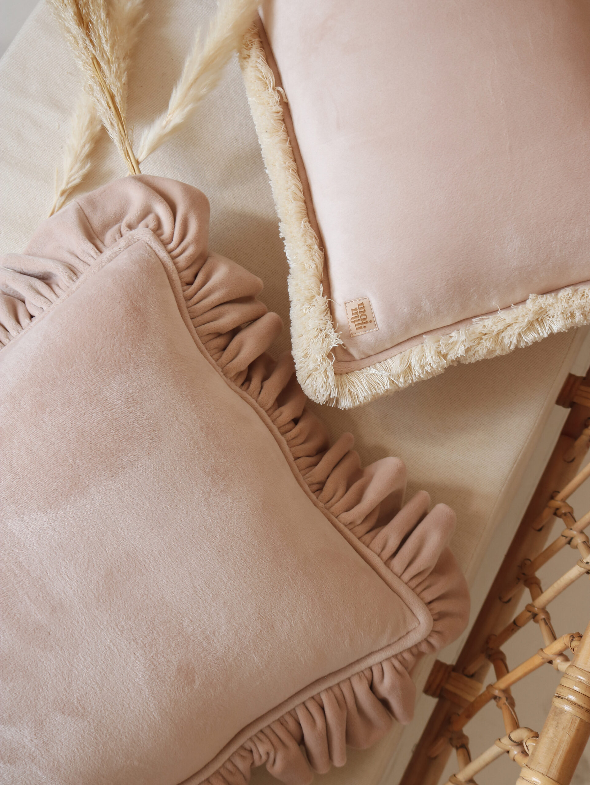 A beautiful fluffy cushion with a romantic frill, carefully sewn from high quality coffee with milk velvet fabric with elastane that lays beautifully and shines. Super soft to touch, for the bedroom and the living room.